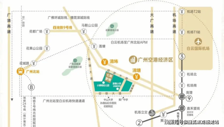 交通:项目距地铁9号线清㘵站直线距离约800米,车程3分钟;距广州北站直线距离约3公里,车程10分钟,便捷通达全城。