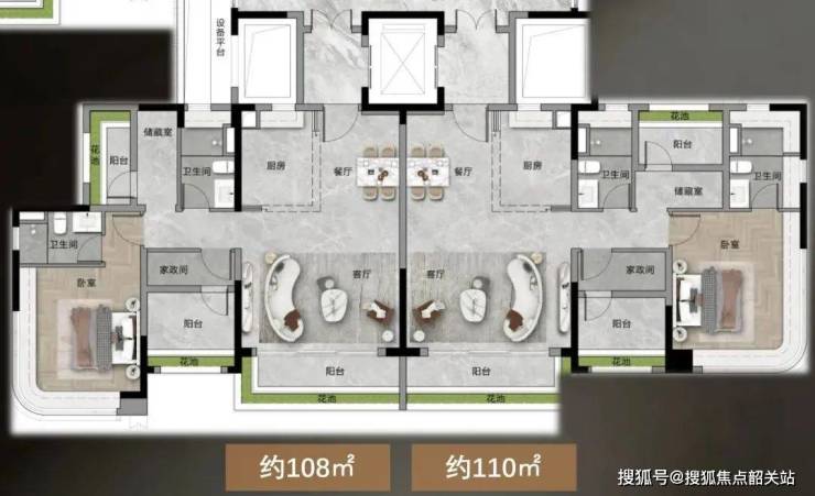 其中,建面108㎡户型和建面110㎡户型在布局上整体一致,都是LDK一体化设计的1+2房,开放式厨房+大开间客厅+大景观阳台+主卧270°弧形飘窗,无论是采光还是景观方面都十分出彩。