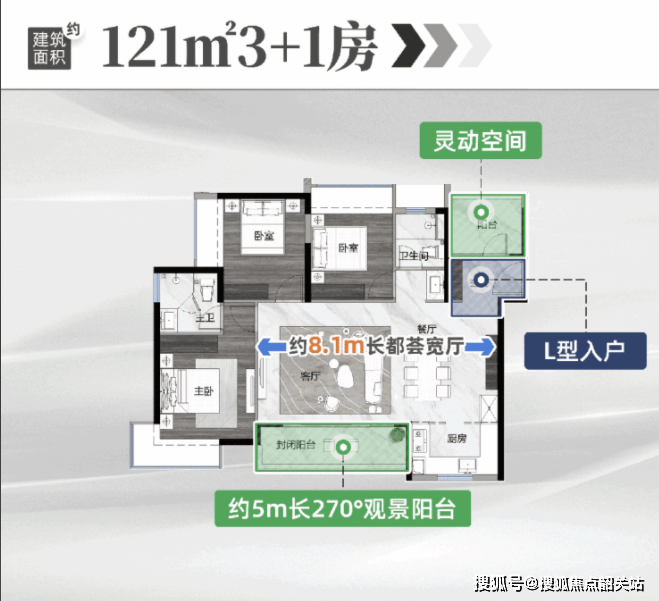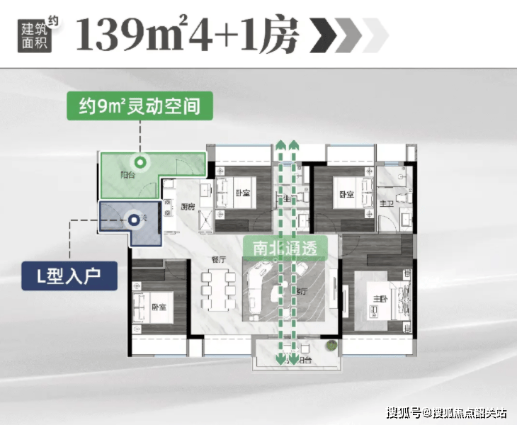 125㎡四房:单边位南北对流,55㎡LDKB 奢厅搭配 5.7 米阳台,主卧 270°环幕景观窗采光极佳。