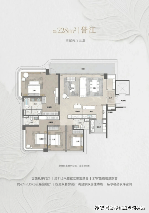 建面约228㎡四室两厅三卫(誉江):项目的旗舰户型,专为终极置业者打造。该户型拥有约16米的L型超大阳台,实现了真正的“空中别墅”体验。主卧开间可达约6.8米,配备超28㎡的超级主套(含独立衣帽间、豪华卫浴),部分户型主卧甚至能北向望江,西面还有阳光补充,空间舒展度极高。LDKB一体化设计使得客餐厅面宽达到11.5米,家族聚会、商务宴请皆显气派。