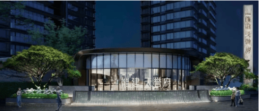 项目外立面采用钻感玻璃幕墙设计,窗地比高达0.36(行业均值≤0.25),突破了住宅采光的极限。这种公建化的外立面不仅颜值极高,更将江景最大化地引入室内,形成“空间沉浸感”。社区入口打造了近80米超宽的高定门庭,采用白金砖、白金沙花岗岩及深香槟金铝板等奢华材质,配合迎宾水景,气势恢宏。项目还设计了奢雅双入户大堂(园林大堂与车库大堂),让归家之路充满仪式感。