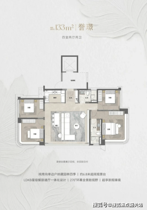 项目主推建面约133-228㎡的纯四房户型,全部采用LDKB洄游方厅设计,客餐厨环形动线流畅,空间感极佳。