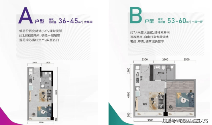 35㎡一房一厅一卫户型:该户型是项目的入门级户型,适合单身人士自住或投资出租。户型方正,南北通透,采光通风效果好,客厅和卧室分区明确,客厅连接阳台,能够增加室内的采光和通风,同时也为业主提供了一个休闲娱乐的空间;卧室空间宽敞,能够满足日常居住需求,衣柜设计合理,增加了储物空间;厨房和卫生间配套齐全,厨房采用开放式设计,节省空间,同时也方便烹饪;卫生间干湿分离,保持室内的干燥整洁,提升居住舒适度。该户型总价低、首付低、月供低,性价比极高,是单身人士置业和投资客投资的首选户型。
