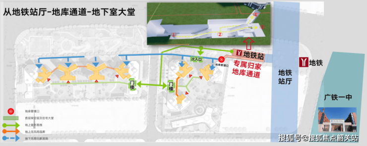 而且,项目巧妙设计了三大归家系统,与地铁站厅无缝衔接:首层的架空层、地上风雨连廊、地下车库专属通道。