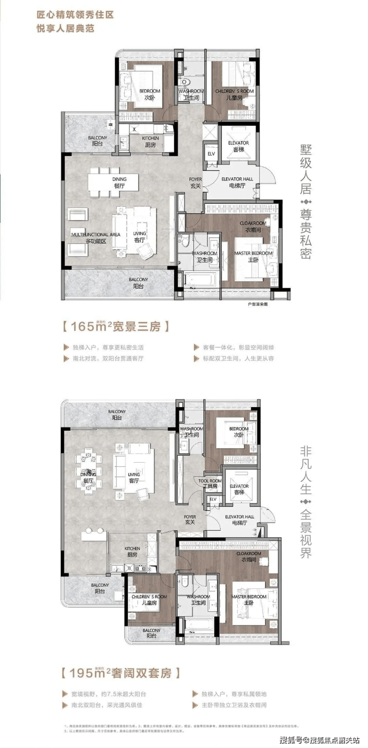 项目主推建筑面积约165至200平方米的大平层户型,共计66套房源。所有户型均采用专梯专户、纯板式设计,特别适合追求高端改善群体。其中,约165平方米的三房户型布局方正,南北通透,配备双阳台,确保室内采光充足且通风良好。