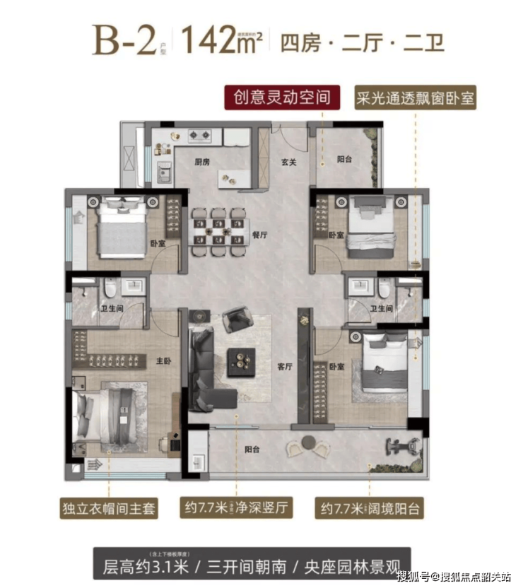特点:独立衣帽间主套,约7.7米净深竖厅搭配约7.7米阔境阳台,采光通透,三开间朝南还能欣赏央座园林景观。