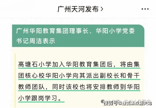 社区斜对面是高塘石小学,是距离项目最近的公办小学,该校创办于1948年,从村办小学发展为“全国青少年校园足球特色学校”,目前为12个班规模,根据天河区官方规划,该校将在3年内扩建到24个班,改扩建工程已顺利取得用地批复,总投资约9975万元,新增建筑面积超9000平方米,将有效缓解区域学位紧张状况。2023年,天河政府官微已官宣该校加入华阳教育集团,并由原华阳小学派出副校长和骨干教师团队进驻,相当于拥有纯净“华阳系”血统,华阳小学为广州三甲、天河第一梯队小学,办学实力雄厚,能够为学生提供优质的小学教育。