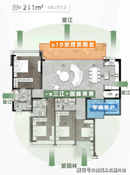 建面约211㎡户型,总价888万起,位于30层高楼栋,南北双面望江,白天鹅建筑群天际线尽收眼底,视野层次丰富,动静分区科学,生活秩序井然。