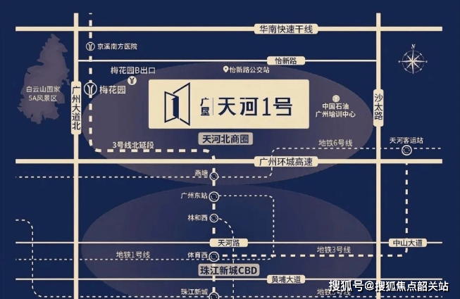广垦·天河1号地理位置极为便利,西面约400米是地铁3号线梅花园站B出口,两站到达广州东站,五站直达珠江新城。项目周边还有广州大道、沙太路以及环城高速、内环路、华南快速等重要交通线路,半小时内畅达全城,并可通过高速路网实现1小时内到达粤港澳大湾区其他城市。
