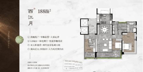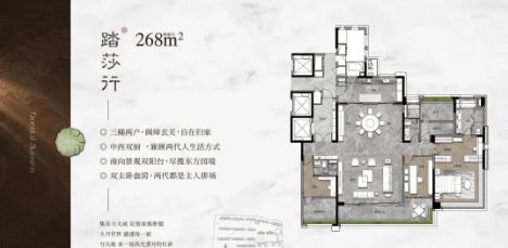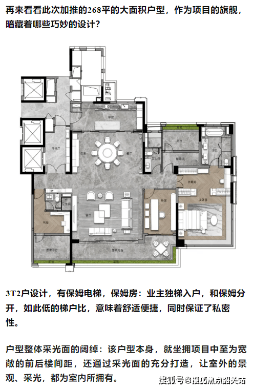 268平方米大平层:3梯2户设计,包含保姆电梯,拥有超大面积的LDKG大方厅和主卧步入式衣帽间,适合大家庭或高端客户。