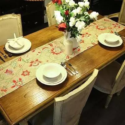 还有桌旗装饰,一般铺上桌旗,放上花,颜值很高很美。吃饭的时候就把陈设品和桌旗都收起来,这样会很麻烦。