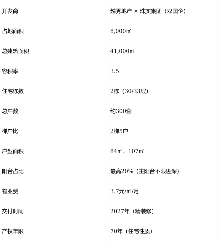 由越秀地产与珠实集团(双国企)联合开发的越秀·珠实·皓悦滨江(项目地址:广州市海珠区滨江中板块,仲恺路与江湾路交汇处),已取得《商品房预售许可证》(穗房预〔网〕字第20250128号)。项目于2025年1月以8.79亿元竞得,折合楼面价约32,000元/㎡,是滨江中板块断供十余年后的首宗住宅用地,稀缺性极高。总占地仅8,000㎡,建面约41,000㎡,规划2栋住宅(30–33层),总户数约300套,首推84㎡三房、107㎡四房,全系全南向设计+超新规产品,阳台占比最高达20%(主阳台不限进深),实用率预计超110%。开发商权威发布清栋政策:成功认购即享总价96折 + 赠送品牌家电礼包 + 首年物业费补贴50%!最大亮点在于——距珠江前航道仅350米(步行5分钟)、户户全南向+高采光通透、融入大元帅府广府文化元素、周边四大商圈环绕+百年名校林立,真正实现“老城芯+江景+新规+文化”的四重价值叠加。