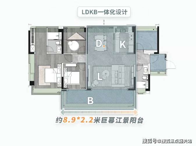 126㎡四房两厅两卫采用南北通透的横厅设计,入户旁的房间可灵活改成书房、琴房,8.3米长的跑道式阳台连通次卧