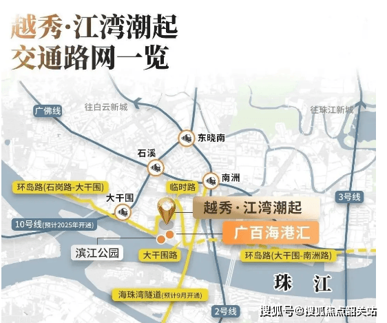 对于上班族来说,交通便利性直接决定生活幸福感。越秀·江湾潮起的交通配置,堪称“通勤自由”的典范。百度地图实测,项目直线距离已开通的10号线大干围站仅650米,步行8分钟就能到地铁站。这条被称为“市区加密线”的地铁,串联起天河、越秀、海珠、荔湾四大核心组团,往北约30分钟到珠江新城、体育西,往西直达滨江东、五羊邨,无论是上班还是休闲,都十分便捷。