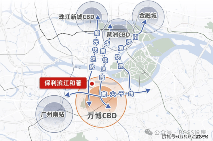 核心卖点二:核心区位加持,发展潜力巨大。项目地处广州发展中轴线上,是万博CBD南拓首站核心腹地,以项目为圆心10公里范围内覆盖珠江新城、琶洲、金融城、万博四大CBD,依托立体交通网络,实现15-30分钟通勤圈,承接四大CBD人口、产业、配套外溢,区域发展潜力巨大,资产保值增值有保障。