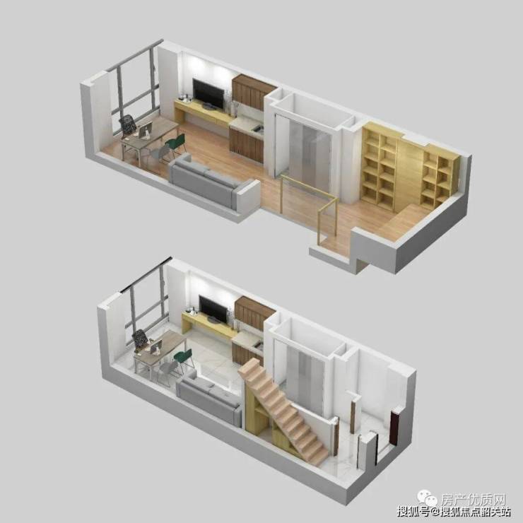 功能可变性高: 下层可规划为客厅、餐厨区及卫生间,上层可作为静谧的卧室区。这种“动静分离”的布局,在小面积中极大提升了居住的舒适度和隐私性。