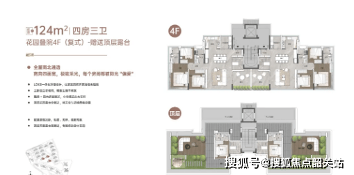 - 四层约124㎡户型:最接近墅级形态的户型,下层做侧花园设计,顶层天面露台全赠送,使用率达242%;户型采用复式设计,空间层次感强,下层为客厅、餐厅、厨房等公共区域,上层为卧室、书房等私密区域,动静分离;侧花园与顶层露台可满足业主休闲、娱乐、观景等需求,视野开阔,江景与园景尽收眼底,适合高端改善家庭。