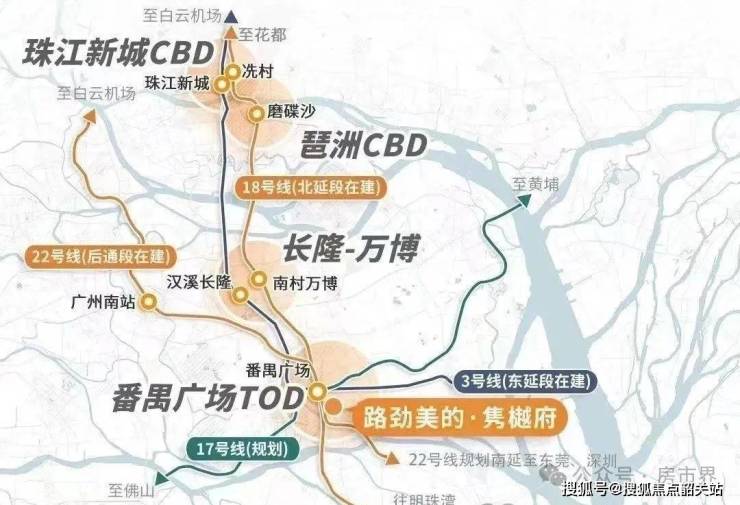【路劲美的·隽樾府】最大的亮点,在于它精准落子于番禺真正的“城市心脏”——番禺区府中轴线上。这里不仅是行政中心,更是未来城市发展的重点区域。项目距离地铁3号线番禺广场站仅约1公里,周边汇聚3号线、18号线、22号线及规划中的17号线,堪称“轨道上的黄金交汇点”。