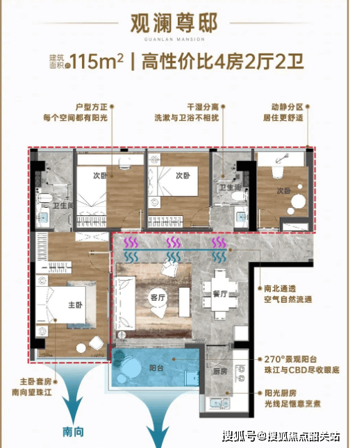 110-115㎡南北对流四房两厅两卫:该户型采用南北对流设计,通风效果极佳;南望江景,北望山景,前后无遮挡,视野开阔,可将金融城、广州塔美景一览无余。户型采用横厅设计,采光面更宽广,让客厅空间显得更加通透大气;四房布局,配备两个卫生间,能满足改善型家庭或多人口家庭的居住需求,主卧为套间设计,保证业主的私密性与舒适度。