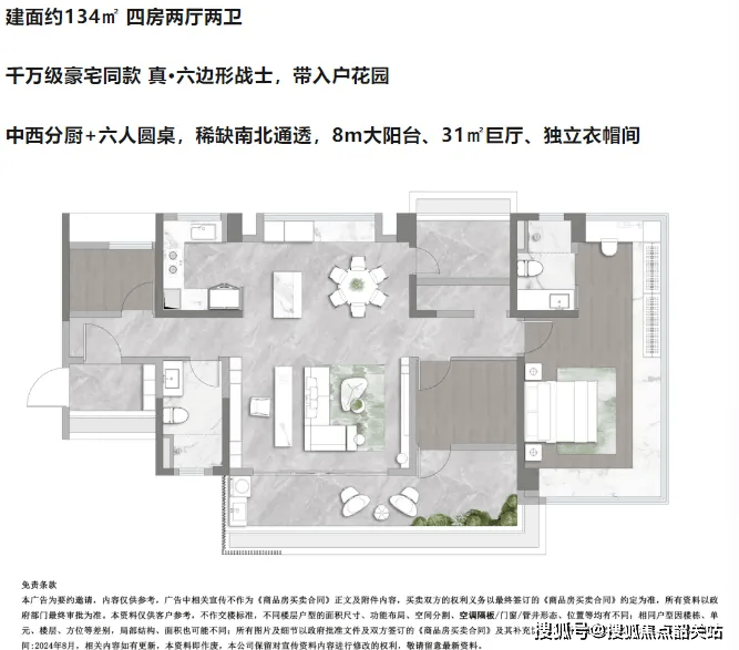134㎡的四房两厅两卫户型,是项目的终极改善产品,空间尺度极为舒适,目前剩余房源不多,先到先得。该户型配备独立入户花园,入户即可感受到归家的仪式感;8米的超大阳台搭配31㎡的巨厅,空间开阔震撼,无论是家庭聚会还是商务宴请,都能轻松hold住。