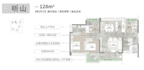 建面128平方米:四房,L型独立玄关,8米的L型阳台,南北对流。