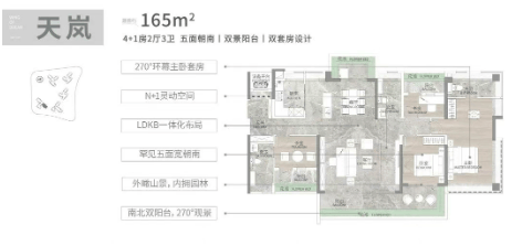 建面165平方米:4+1房大平层,双阳台南北对流,中式厨房+独立西式岛台,三面望山景。