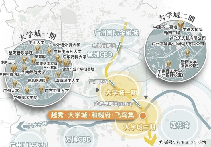 越秀大学城和樾府·飞鸟集隶属于越秀大学城和樾府项目,由越秀地产倾力打造,坐落于广州市番禺区大学城二期国际创新城板块,该板块作为广州科创中轴与广深澳科技创新走廊的交汇点,是广州唯一具备斯坦福+硅谷“产学研商居”一体化模式的核心区域,承载着城市科创发展与人文居住的双重使命。项目整体规划为5个地块分期开发,首开地块布局合理、业态丰富,涵盖11栋16-24层住宅及2栋13层商办公寓,形成业态互补、圈层纯粹的复合型居住社区。