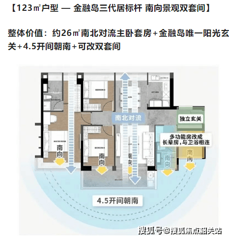 123㎡户型:三代居标杆,南北对流主卧套房和金融岛唯一阳光玄关。
