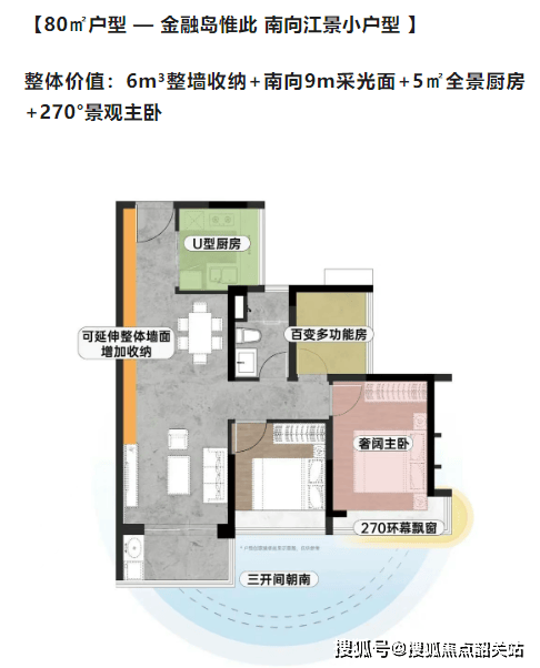 80㎡户型:南向江景小户型,配备6m³整墙收纳空间和5㎡全景厨房。