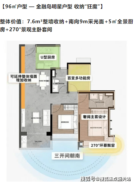 96㎡户型:明星户型,拥有7.6m³整墙收纳空间和270°景观主卧套间。