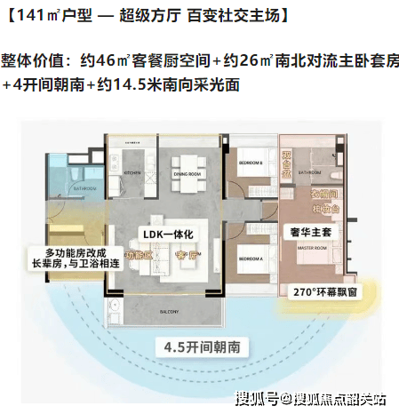 141㎡户型:超级方厅,百变社交主场,包含约46㎡客餐厨空间和4开间朝南。