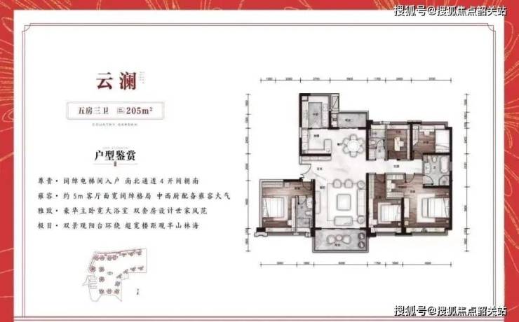205㎡奢华五房:约5m客厅阔绰格局,中西厨配备雍容大气;豪华主卧宽大浴室,双景观阳台环绕。