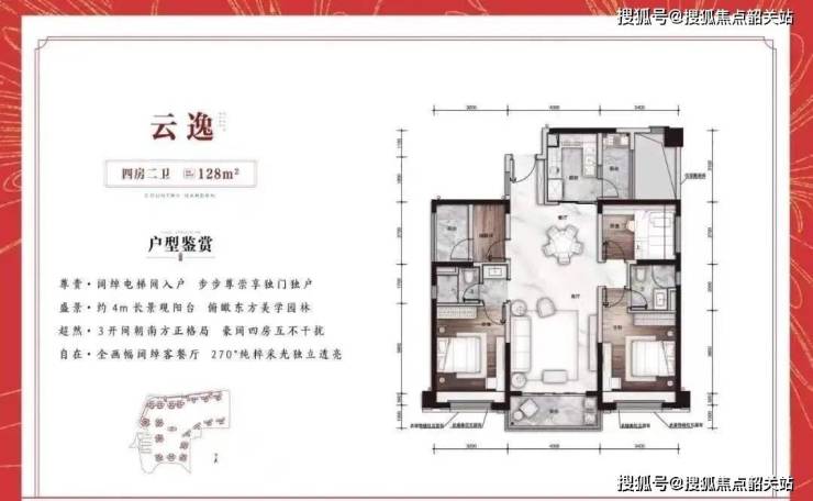 128㎡奢阔四房:约4m长景观阳台,3开间朝南方正格局,豪阔四房互不干扰,270°纯粹采光透亮。