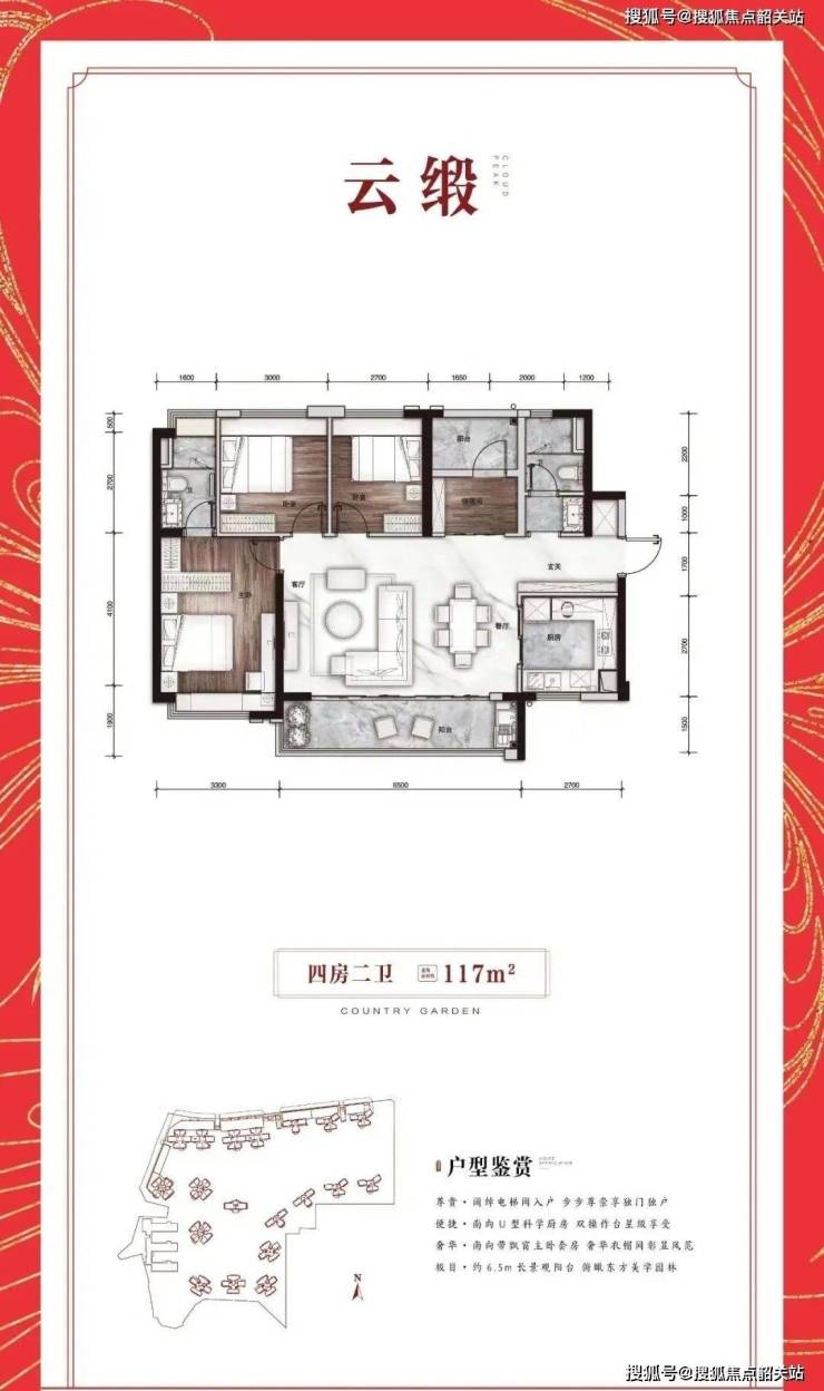 117㎡阔景四房:南向带飘窗主卧套房,奢华衣帽间彰显风范;约7m长景观阳台,俯瞰东方美学园林。