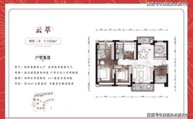 142㎡大气四房:南北通透奢阔四房,户型方正4开间朝南,双阳台诗意雅舍,约30方主卧套间。