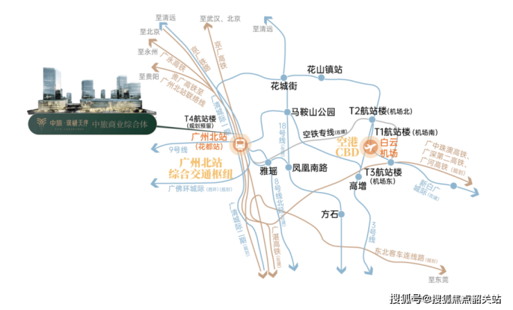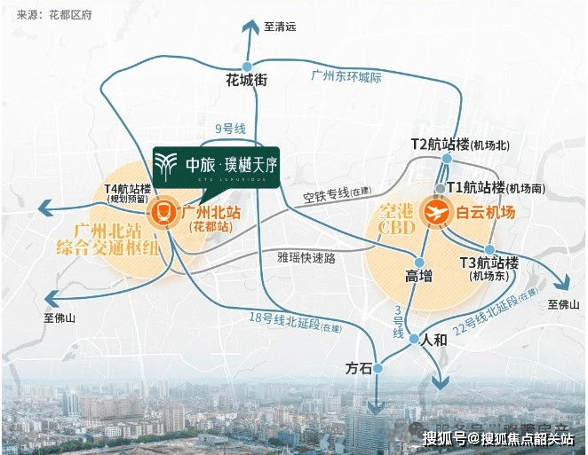 除此之外,项目还可依托白云机场 T4 航站楼、规划中的 APM 线,实现空铁融合的便捷出行,从项目出发可快速通达白云国际机场,满足国内外出行的需求。