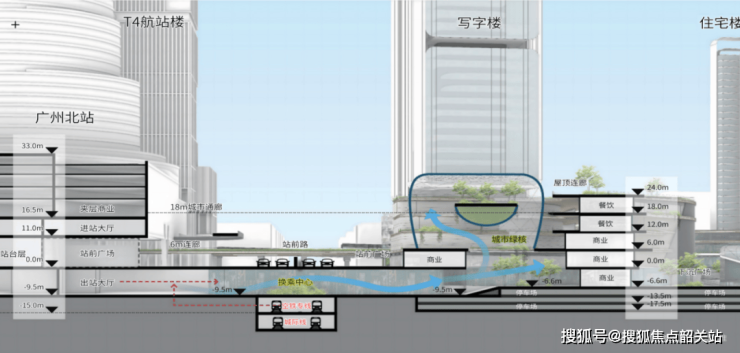 项目通过地下慢行系统,实现了与广州北站、轨道交通站点的无缝衔接,从 - 2 层到 1 层,实现了轨道交通、地下车行、公共人行道、地面行车的系统性衔接,打造了高效便捷的出行体系。