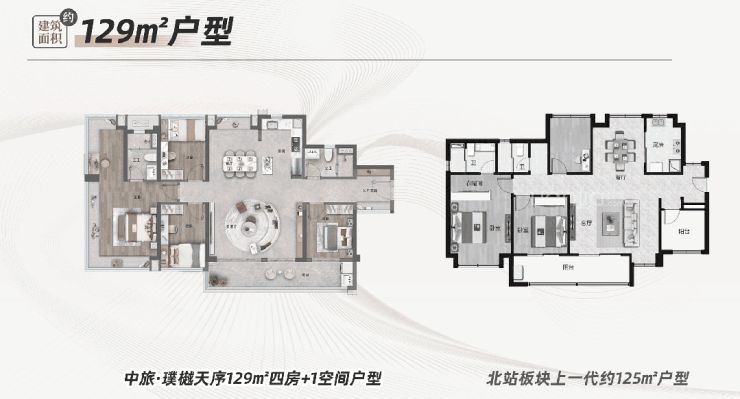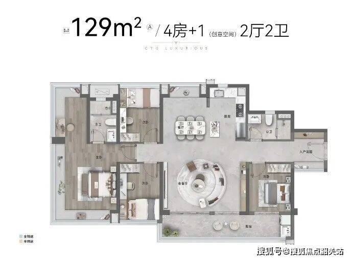 【建面约 129㎡ 4 房 + 1 创意空间 2 厅 2 卫户型】
