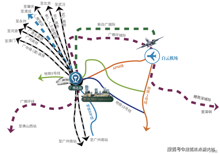 项目周边覆盖武广高铁、京广铁路、广清永高铁(规划中)、广河高铁、广中珠(澳)高铁、贵广 - 广宁联络线 6 条高铁线路。
