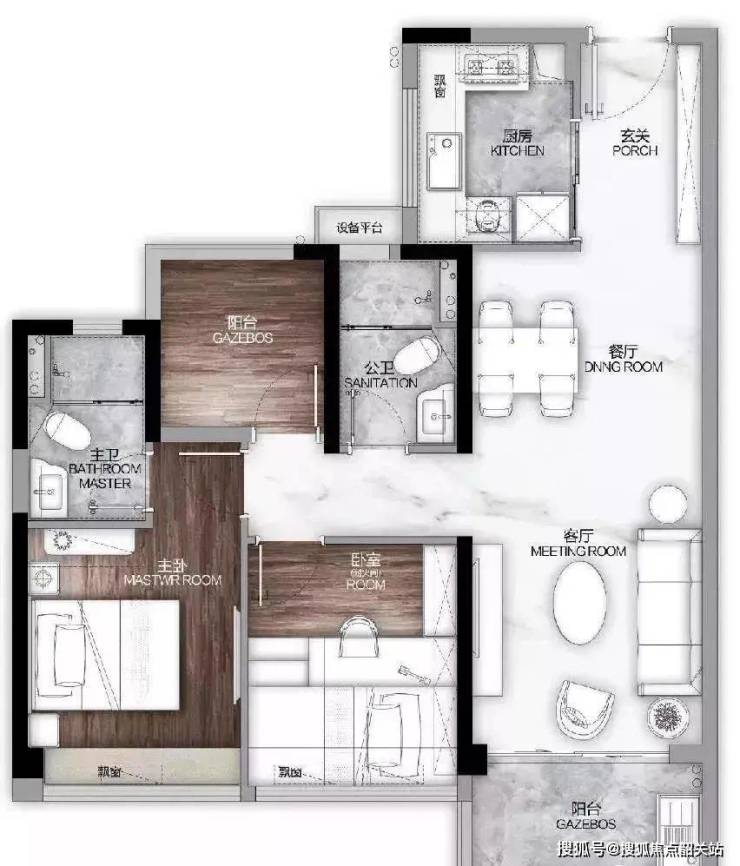 这个户型比较经典实用,是三房两厅两卫设计,并带主套,刚需客可以一步到位。