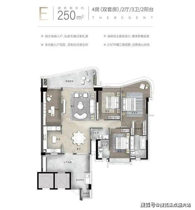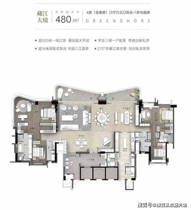 【悦岛】组团约365㎡环幕江景大平层,5房双套房|2厅|4卫|3阳台+1工人套房,双主题风格设计,自然艺术交融,执笔奢适空间品质范本【美学简约】与【现代雅奢】。