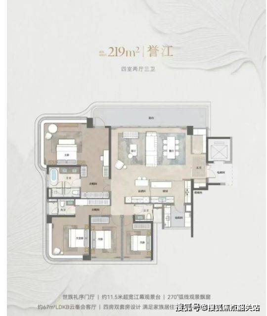 228㎡四室两厅三卫:配备约 11.5 米超宽江幕观景台和约 67㎡LDKB 云峯会客厅,双套房设计,满足家族居住需求。售楼处电话:4009909752。