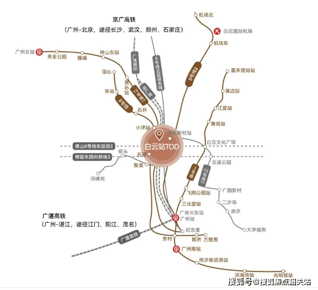 位于广州市白云区的大湾区·诺德云城,得益于其优越的地理位置,享有便捷的交通网络。白云站是亚洲最大的火车站综合枢纽之一,总建筑面积达45.3万平方米,拥有11台24线的站场规模。此外,白云站还计划通过城际铁路实现与白云国际机场的“15分钟直达”,提供无缝中转体验。这种“上天入地”的设计,使得国际旅客可以在此零换乘通达全国,极大地增强了空铁联运的国际竞争力。