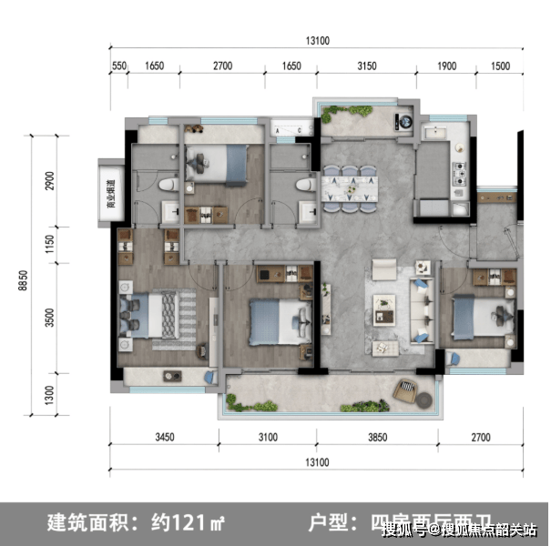 121㎡舒适四房:延续了入户花园和南北对流双阳台的经典设计。约13米的四开间朝南面宽,在同类产品中极为罕见。6.8米的南向主阳台,配合3.45米的主卧开间,营造出宽敞舒适的居住体验。该户型在禅城市场中堪称佼佼者,是同面积段中不可多得的精品。