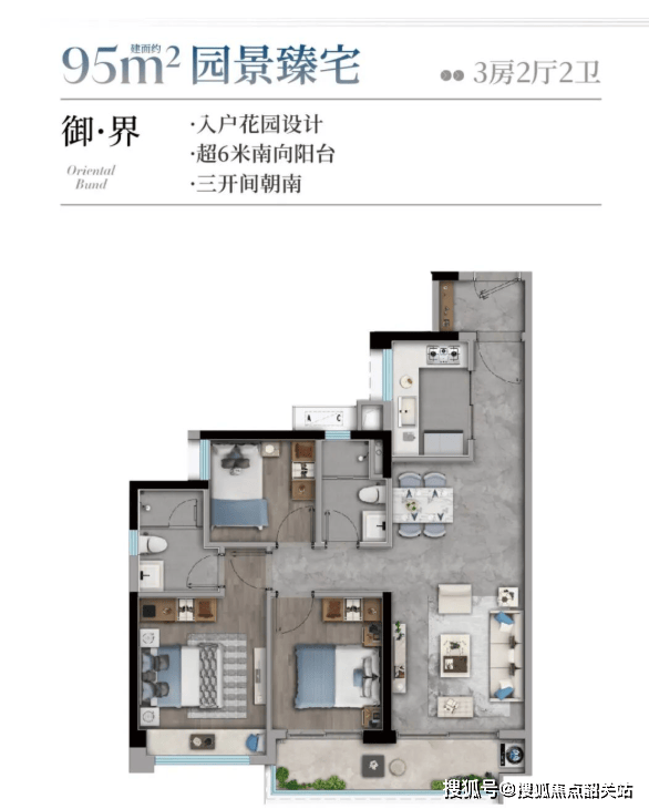 109㎡经典竖厅:入户带有一个带窗的入户花园,增加了储物空间和过渡区域。三开间朝南的设计,保证了充足的日照。超6.4米的南向阳台连接次卧,极大地拓展了活动空间,无论是养花种草还是休闲观景,都游刃有余。