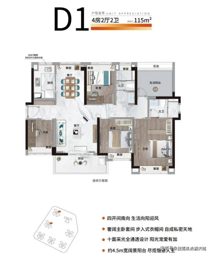 115平方米四房:空间宽敞,适合多人口家庭,主卧套房设计,提升居住舒适度。