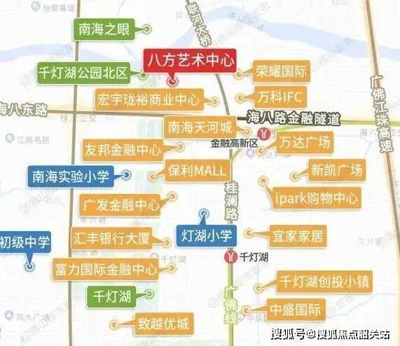 项目距离地铁金融高新区站步行约900米,骑共享单车5分钟就能到。早高峰打车去广州南站大约30分钟,去佛山新城核心区也差不多这个时间。位置在千灯湖金融高新区B区,北边紧挨着千灯湖北公园,南侧就是佛山水道,站在高区能看到对岸正在规划的南海艺术中心。这种“临公园+滨水”的组合,在千灯湖片区已经不多见了。