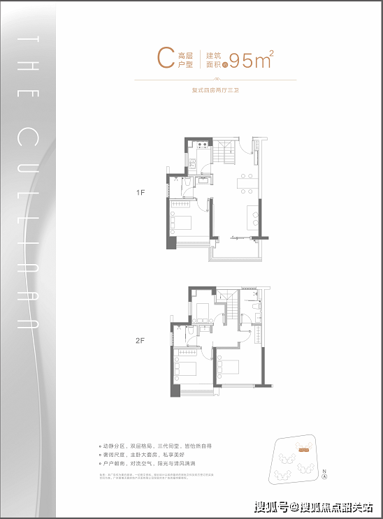C户型:建筑面积约95平方米的复式四房两厅三卫,兼顾了空间利用率与生活舒适度。