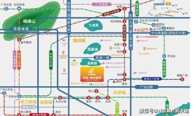 交通方面,距离地铁 14 号线知识城支线旺村站大约 1300 米,步行不太现实,骑小电驴是个方便的接驳方式。不过自驾出行很便捷,有创新大道、永九快速(建设中)两大城市快速路,能快速接驳科学城及天河。同时毗邻花莞高速知识城出口,连通广河高速、华南快速干线、从埔高速(建设中),可便捷畅行湾区发展核心区。虽然地铁稍远,但完善的自驾网络和接驳方式,一定程度上弥补了不足,对于有车一族来说,出行不受太大影响。