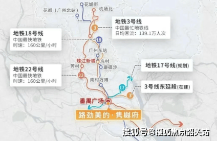项目距 3 号线番禺广场站约 800 - 900 米,该站汇聚 18 号线、22 号线、3 号线以及规划中的 17 号线。搭乘地铁,可直达珠江新城、琶洲等地,无需换乘,轻松畅行城市核心区域。